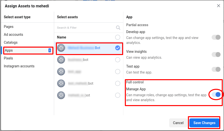 Instantly, a modal will appear. From the Select asset type section of the modal, select the Apps menu. Now select the app to which you want to assign assets. Then give permission. Here I permit Full control by enabling the radio button of the Full control option. Now click on the Save changes button.