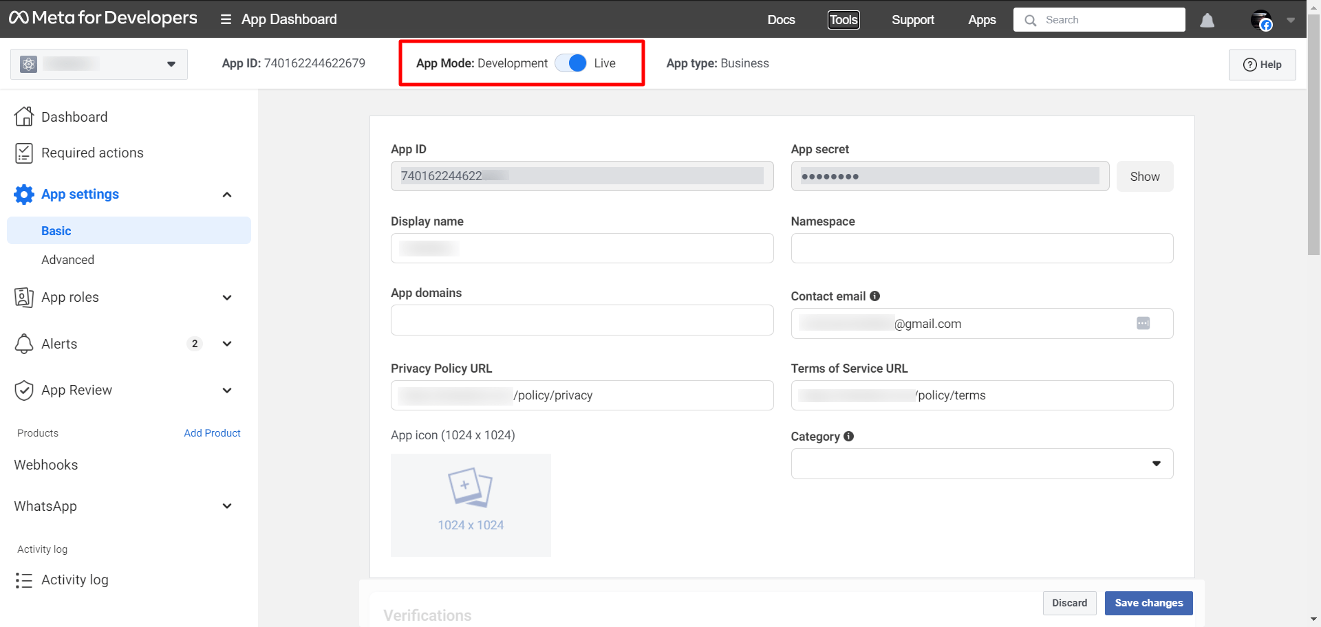Then from the App settings, click on the Basic option and add the Privacy Policy URL and Terms of Service URL from the AiTalkie. These URLs are available on the Connect bot page of AiTalkie. After adding these URLs just click on the “Save changes” button.